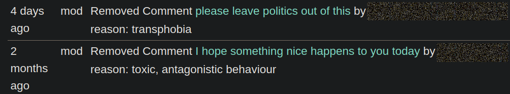 And even if it does, the mods don't have real control to moderate communities either, so you get the worst of both worlds. I don't go to most queer reddit communities anymore because a lot of them have bots that downvote trans-positive posts, even if the community is specifically meant to be inclusive. There's nothing to couple active participation to voting weight or anything of that kind and voting is not considered "brigading" by reddit if the coordination happens off-site (at least not in a way that'd lead to any enforcement action).